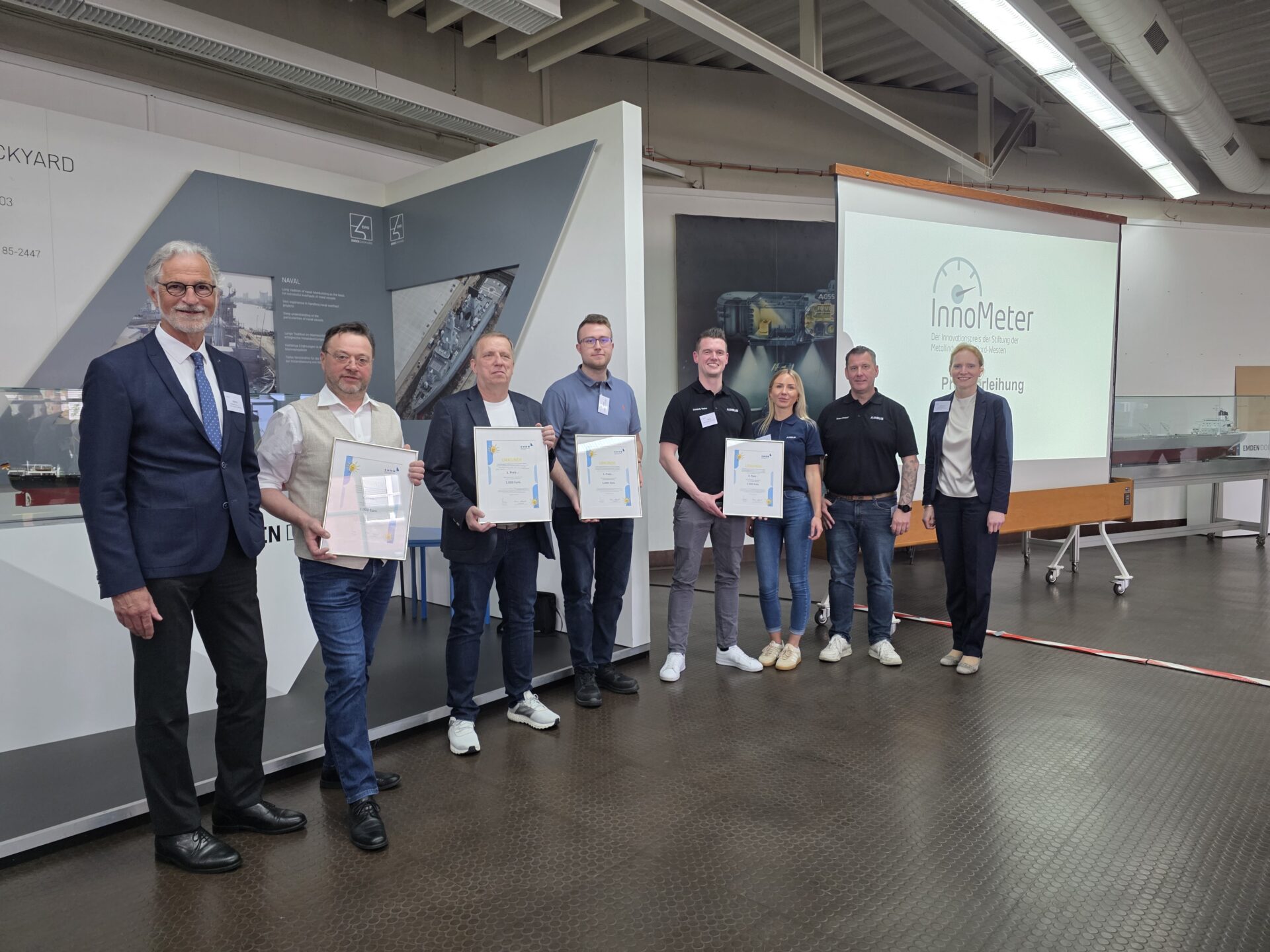 Oldenburg/Nordwesten, 21.04.2026. Erstmalig verlieh die Stiftung der Metallindustrie im Nord-Westen (SMNW) den „InnoMeter“, den Innovationspreis für die besten und innovativsten Verbesserungsvorschläge von Mitarbeiterinnen und Mitarbeitern. Erster Gewinner des „InnoMeter“ ist ein Projekt der Airbus Aerostructures GmbH aus Varel. Folkmar Ukena, Vorsitzender der Stiftung, übergab den Preis gestern in den Räumen der Emder Werft und Dock GmbH in Emden. Der 1. Preis ist mit 3.000 Euro dotiert.